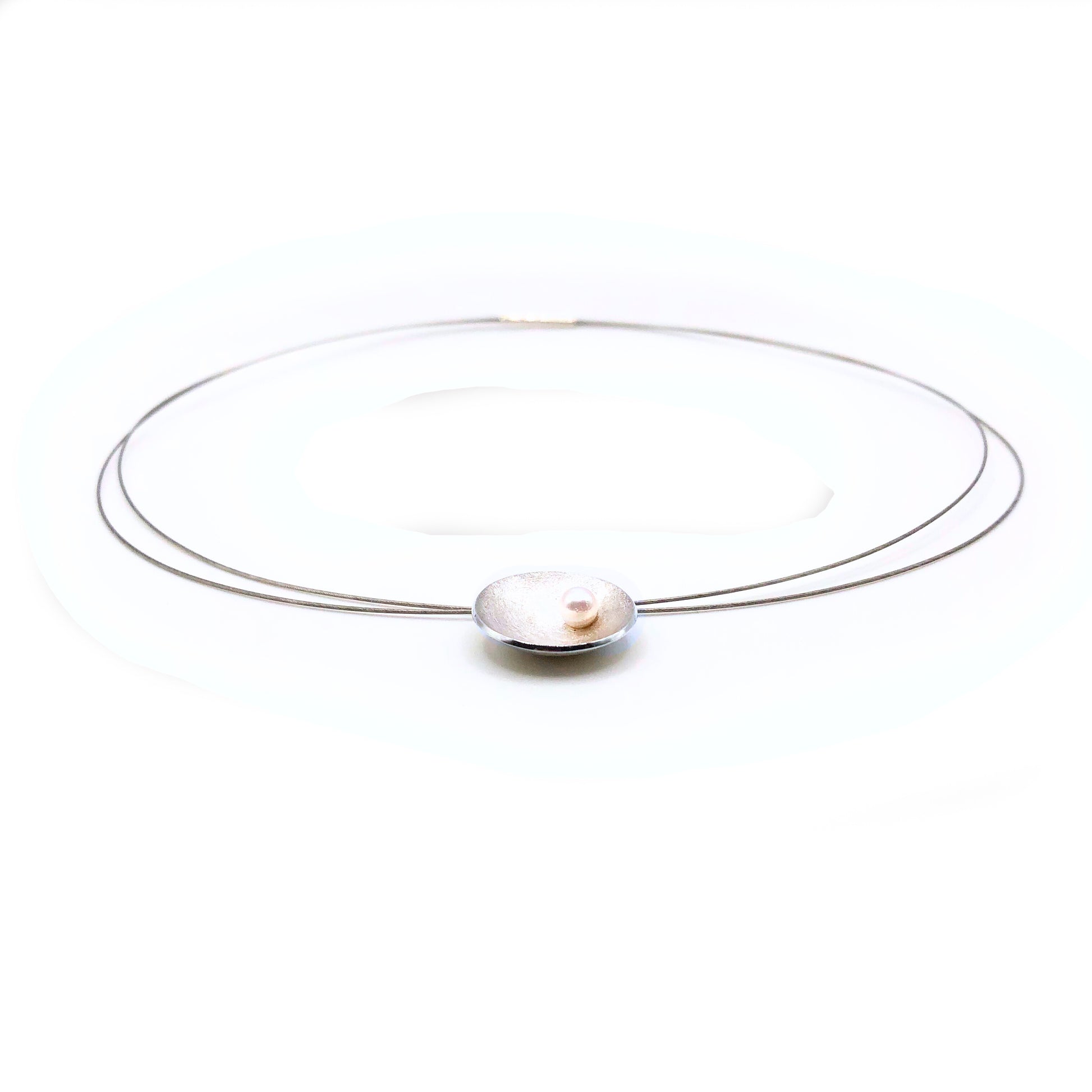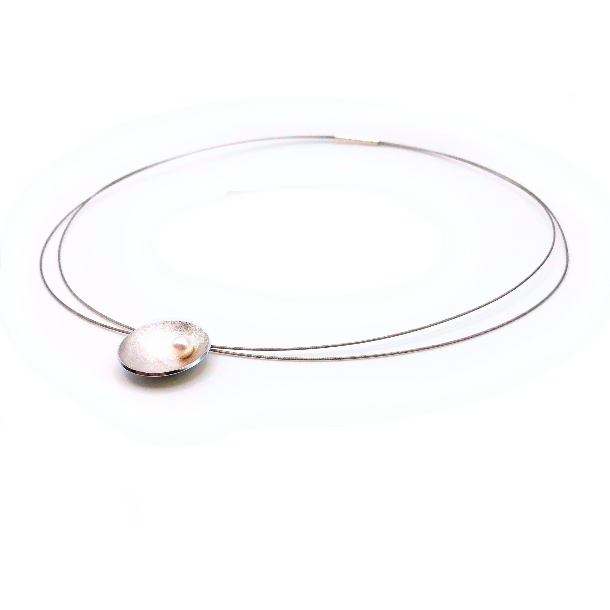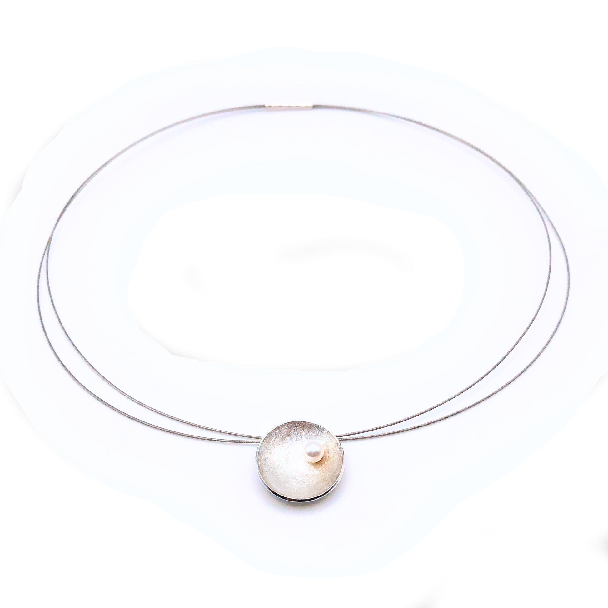 Edler Halsreif mit Perlen Anhänger. Der Anhänger ist aus 925 Silber gearbeitet, geziert von einer creme farbenen Akoya Perle. Der zarte Reif wird mit einem Bajonettverschluss aus Silber geschlossen.